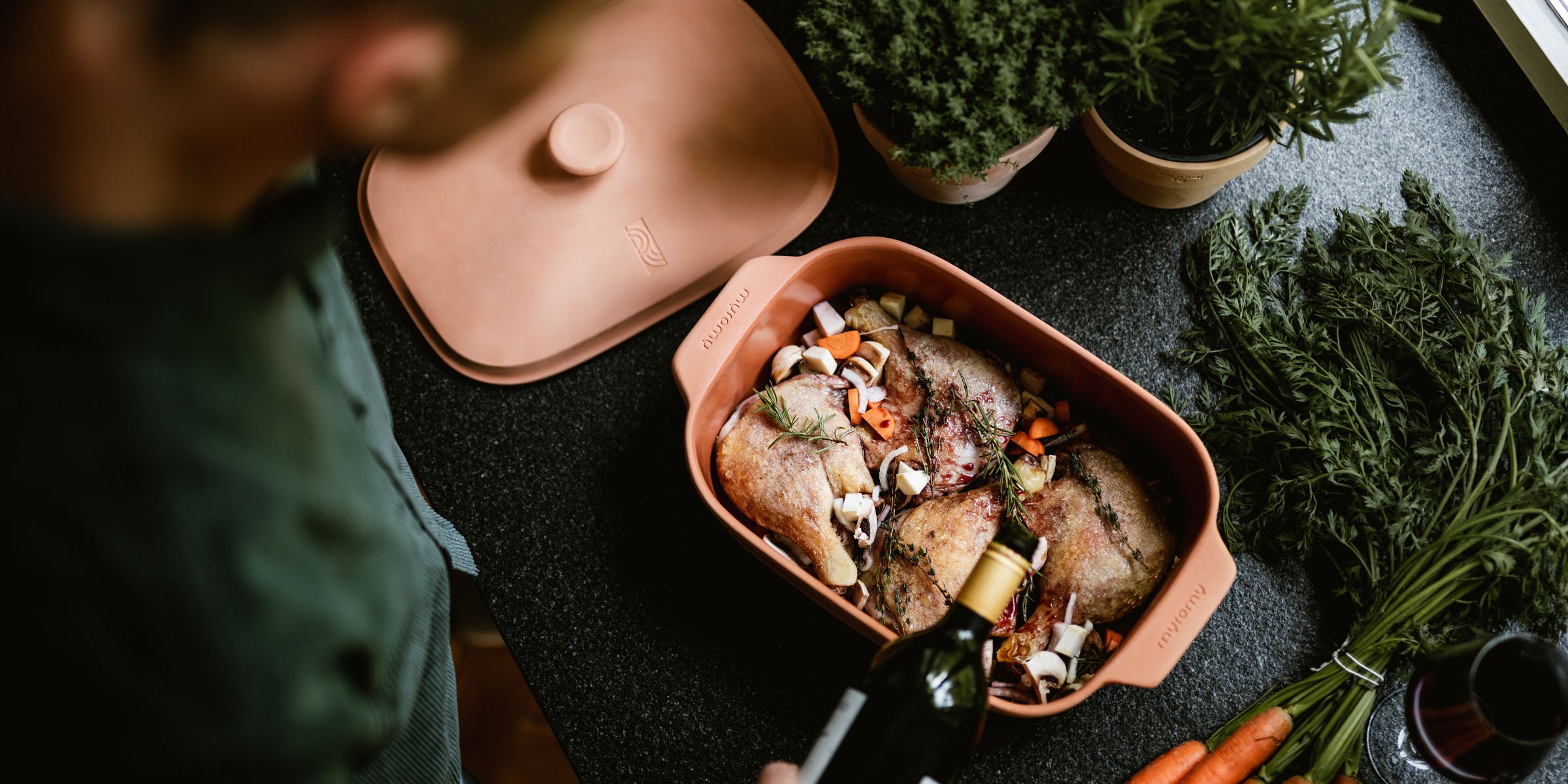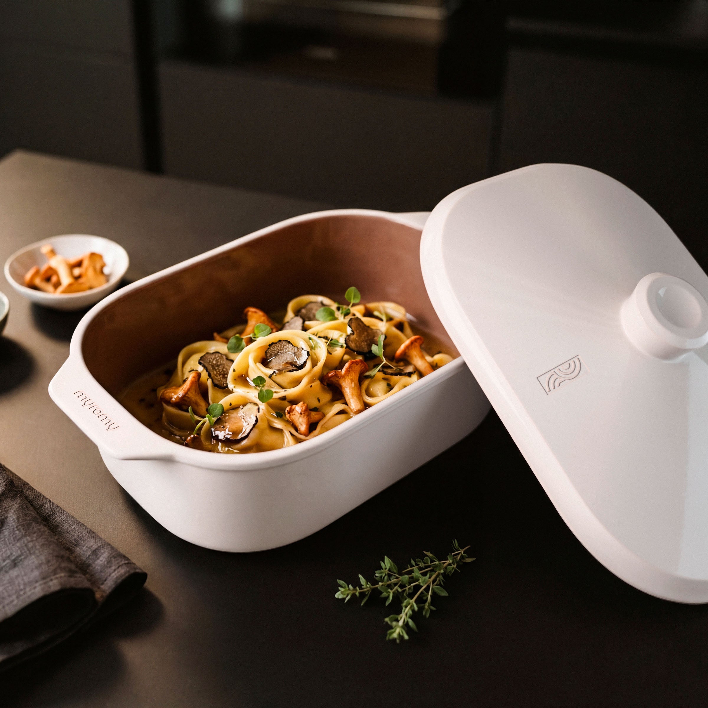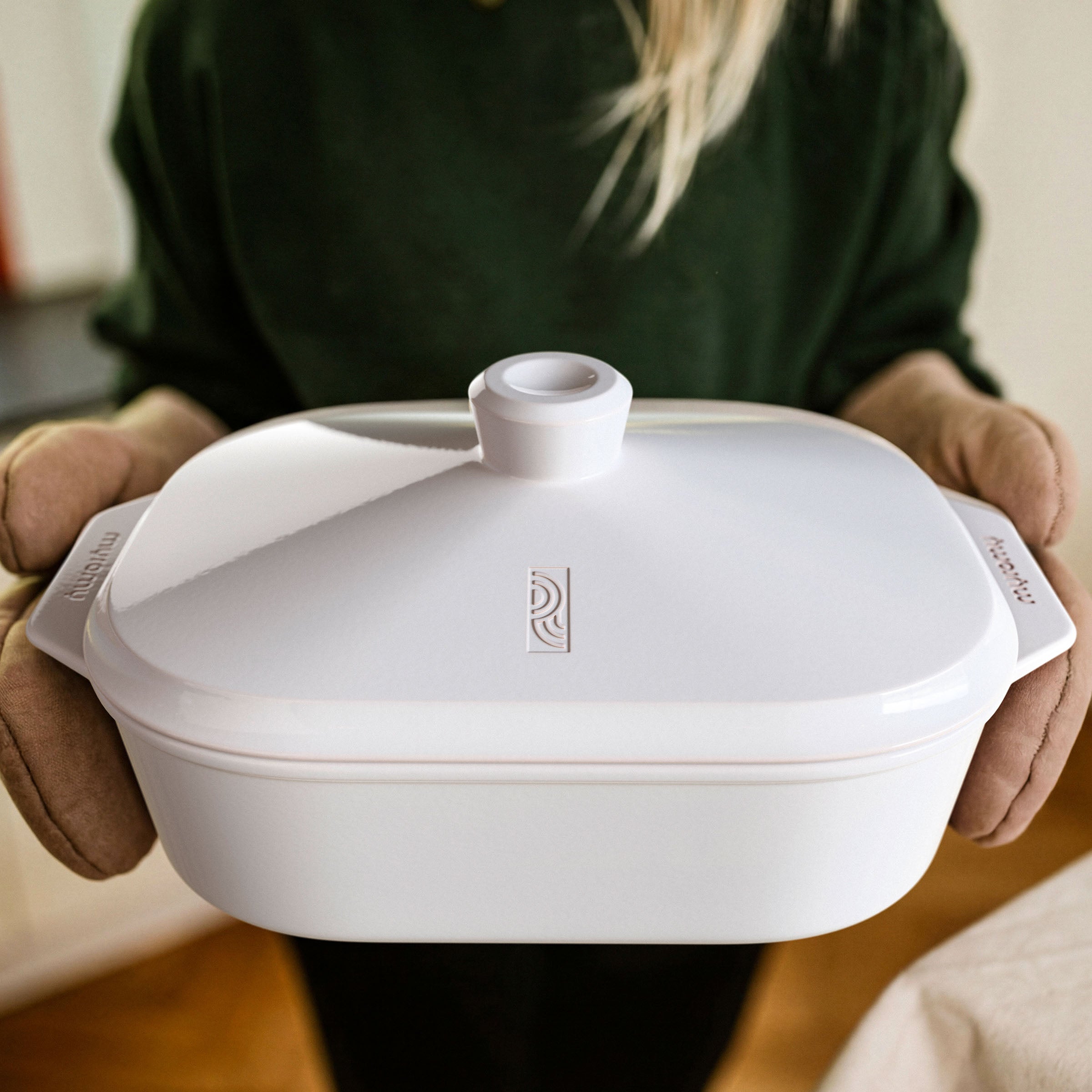 The myromy Multi-Roaster is a cooking and serving utensil in one. With its minimalist design, it fits seamlessly on any dining table—whether for a relaxed family meal or a festive dinner. The ceramic retains heat for a long time, so your dishes stay ready to enjoy for a long time. And if there are any leftovers, the roaster also serves as an elegant storage option: simply put the lid on and refrigerate after it has cooled. It can also be gently reheated without transferring the food.