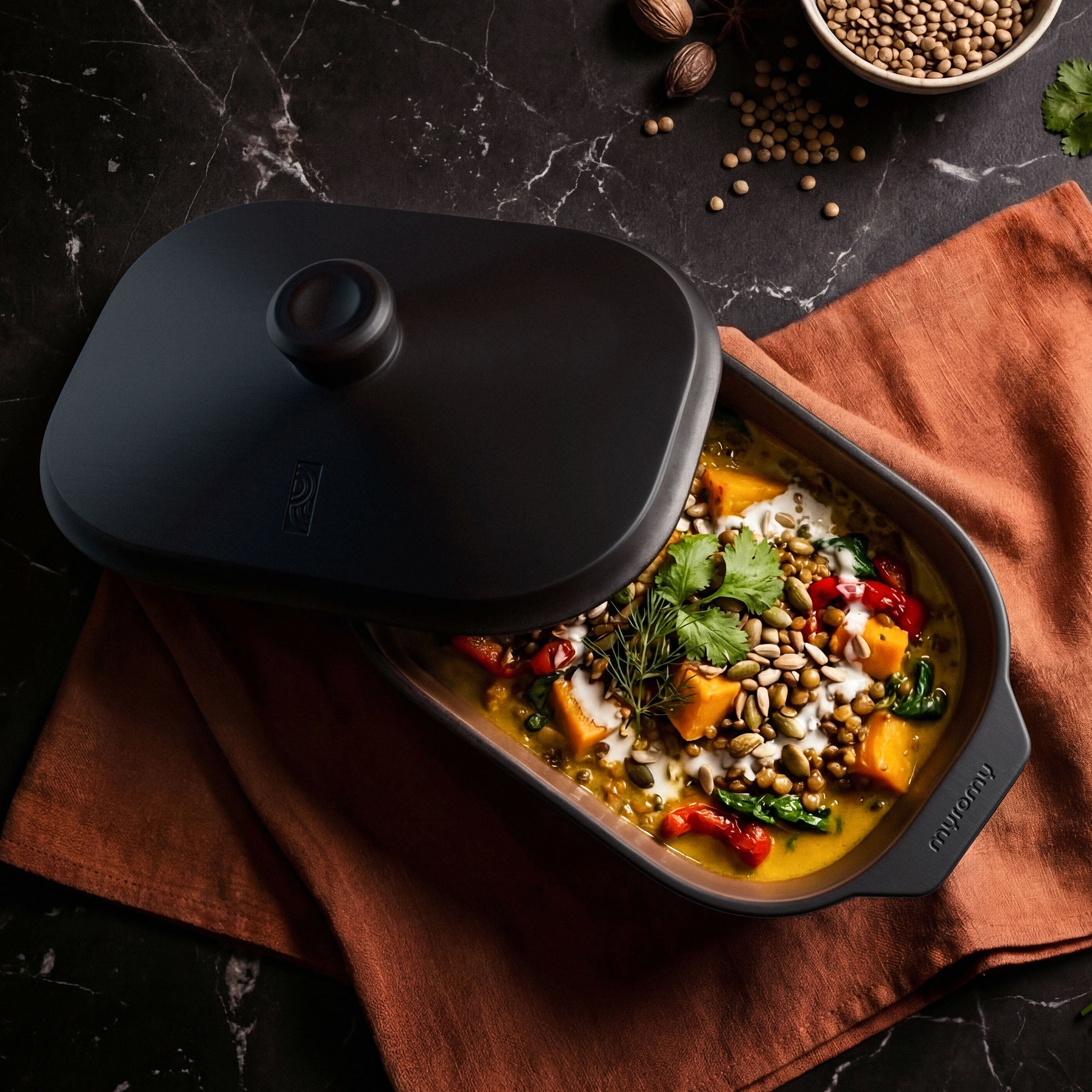 The myromy multi-roaster – your all-rounder made from Westerwald ceramics – combines cooking, braising, baking and serving in one.
